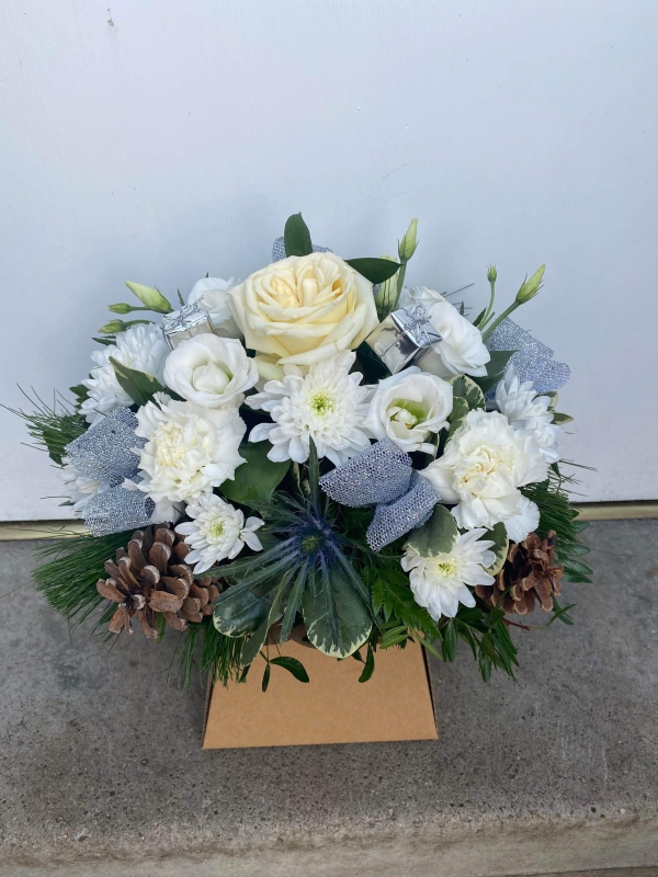 let one of our florist create a party box design for your chosen gift, we can create these in the xmas reds or xmas whites and whilst flowers may vary each design will be made unique to your choice , this design is made in oasis and therefore needs little maintenance for your product to stay fresh, it can also double up as a table centre if you wish for xmas day, please indicate your preference of colour at checkout